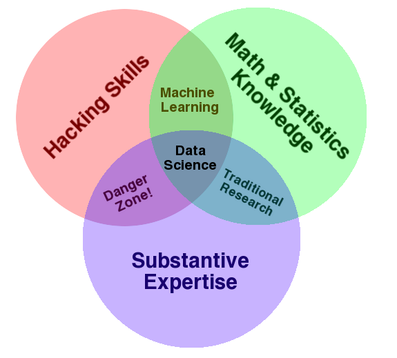 The market is converging the idea of growth hacking with growth marketing but the word “hacking” brings an idea of subversiveness. If you look at the definition of data science, you see some Venn diagrams (see below) which include hacking skills as well. Hacking represents the idea that you can deal with debugging, scraping and other challenges, which is useful but not the core of what a data scientist does. The core is to learn the tools, understand the technology and so on. So I prefer the term growth marketer.